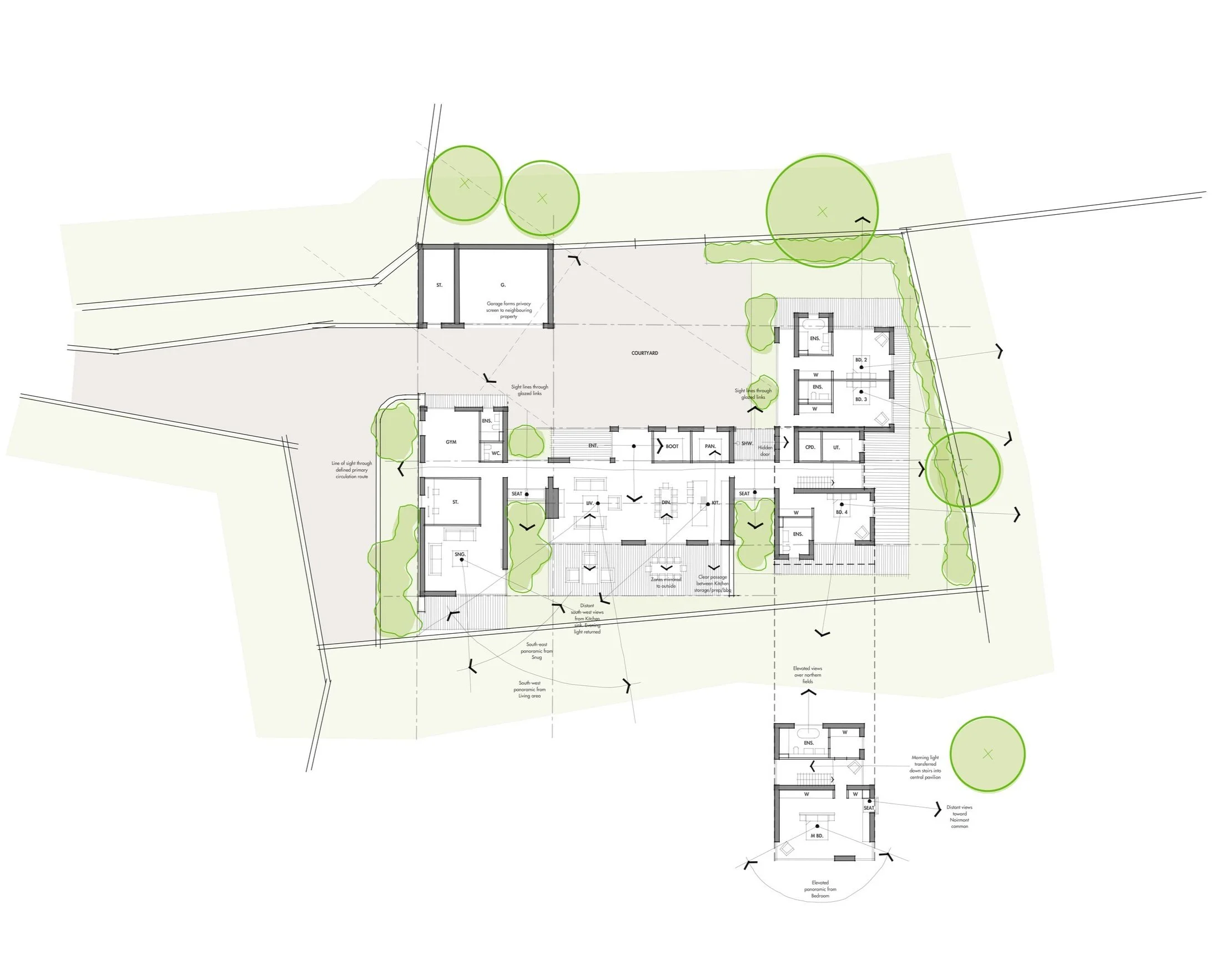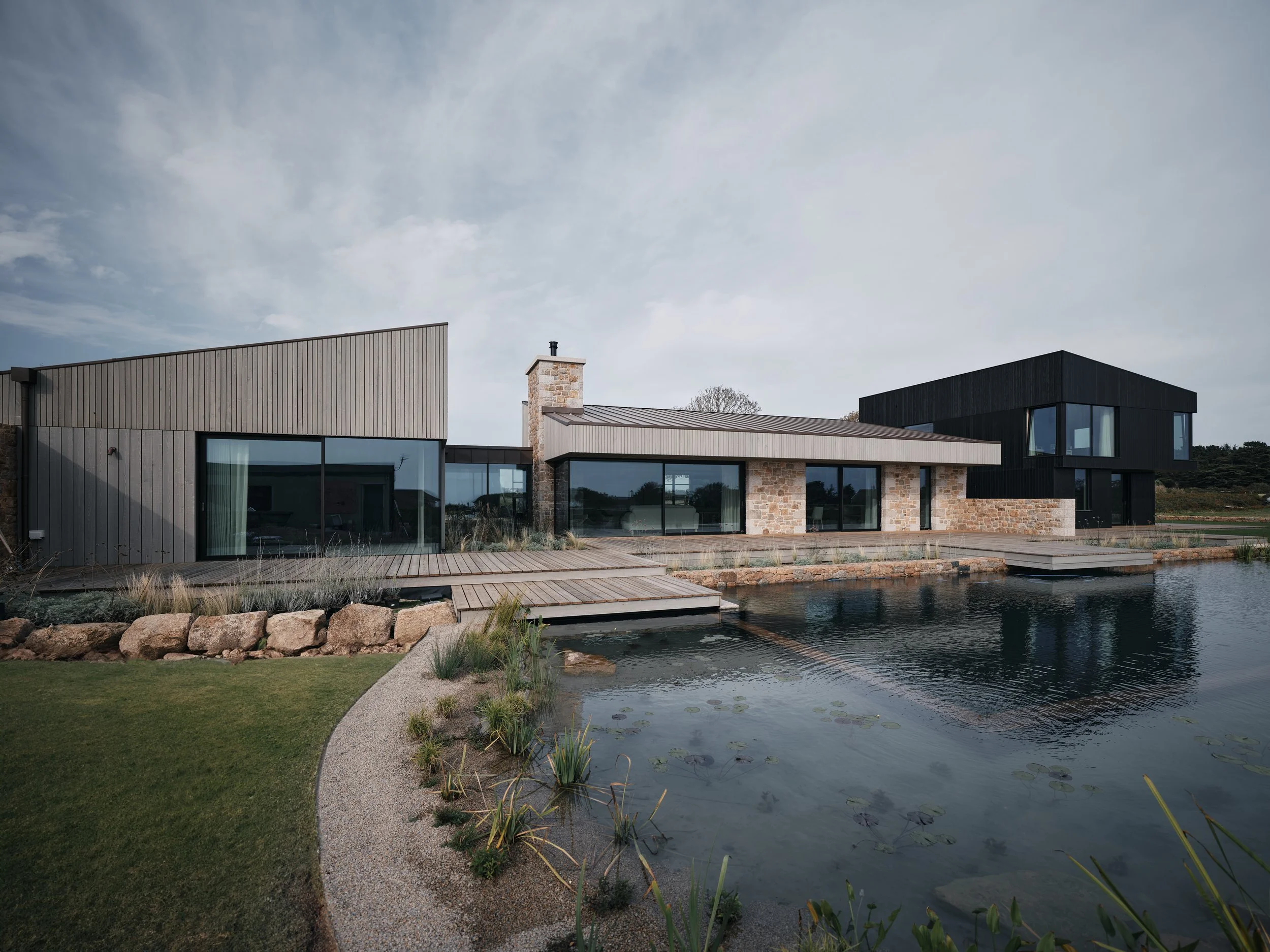 Noirmont Farm is a contemporary family home, thoughtfully integrated within its ecologically sensitive Green Zone setting. The design arranges three distinct pavilions around a courtyard, using natural materials and glazed links to echo the fragmented farmstead character while enhancing the surrounding habitat.